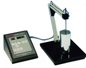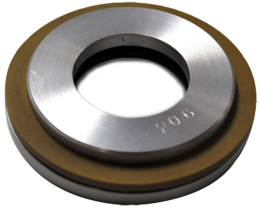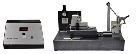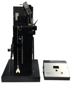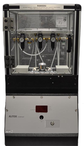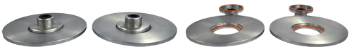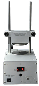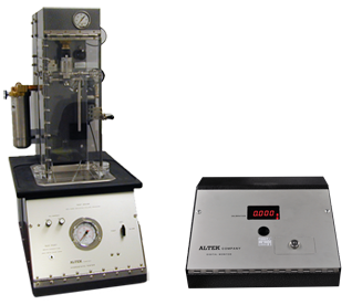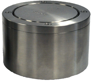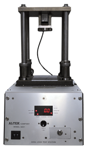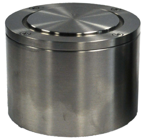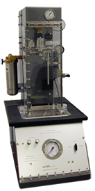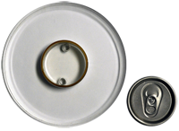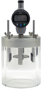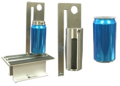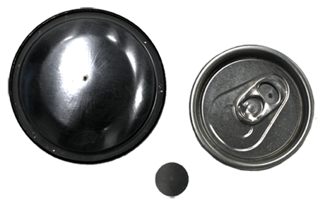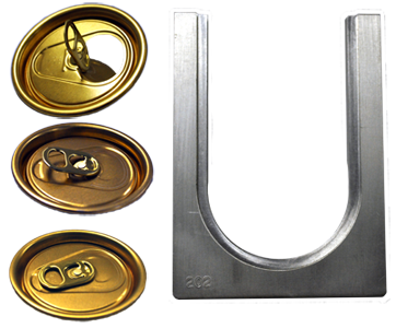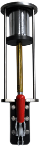 The top insert is machined to fit the can neck, while the bottom insert is molded to fit the bottom of the samples to be tested. These inserts are mounted on rings, which are held together with threaded connecting rods, and the bottom ring slides via an adjustable clamp. The sample is placed inside the cage and the clamp is then closed, securing the sample between the top and bottom inserts.